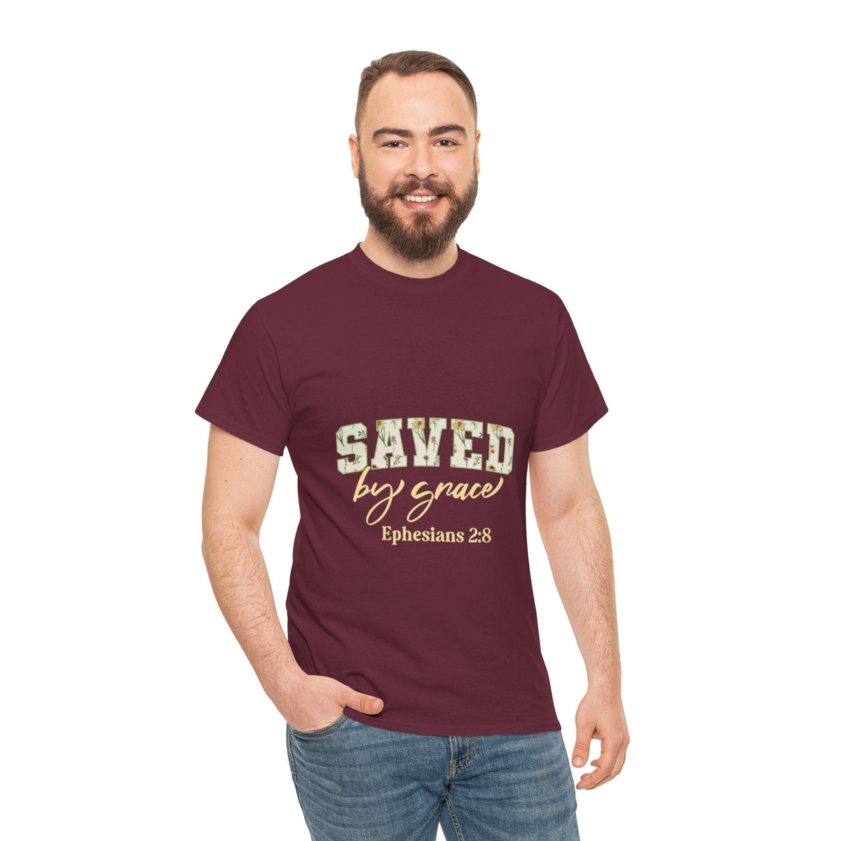 Christian Graphic T-Shirt- Saved by Grace - Maroon / S