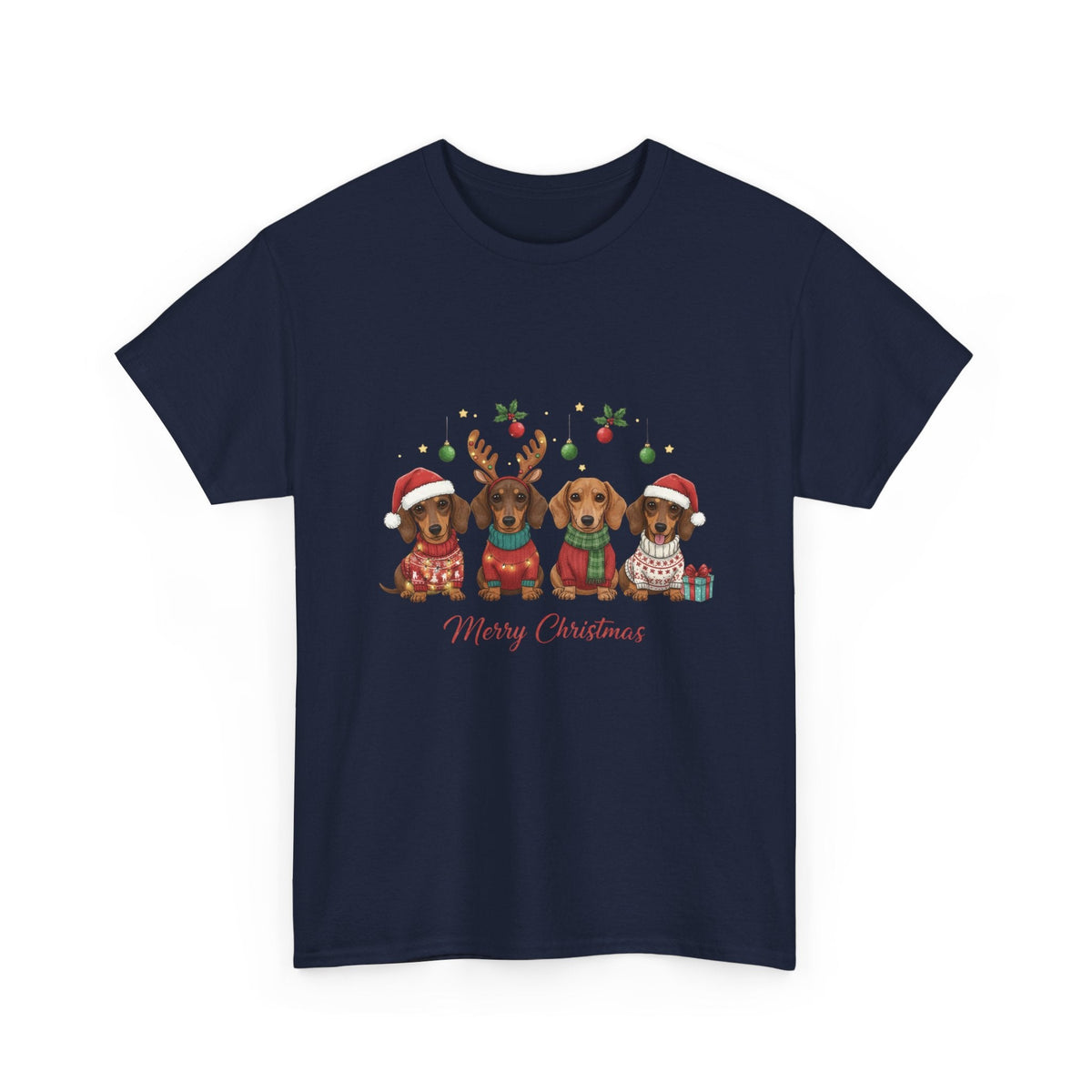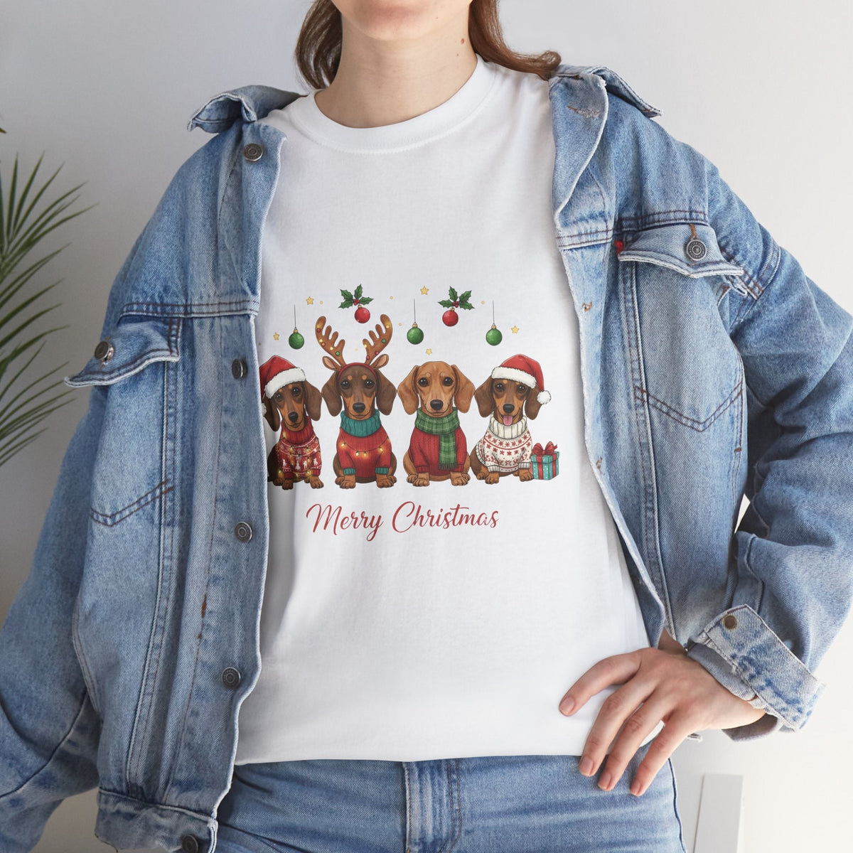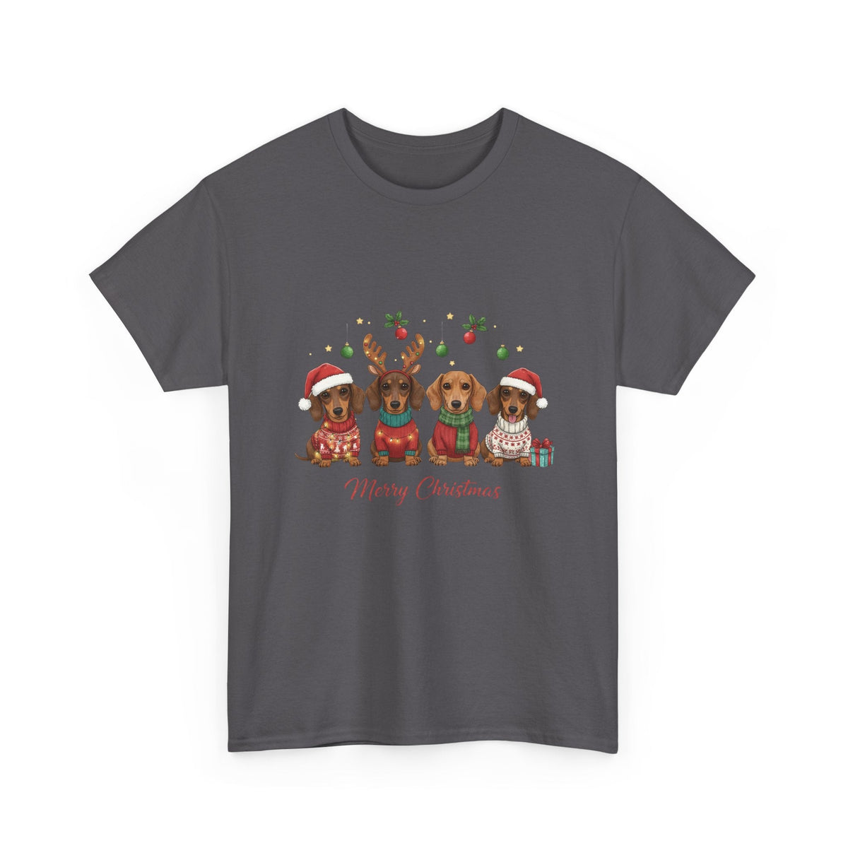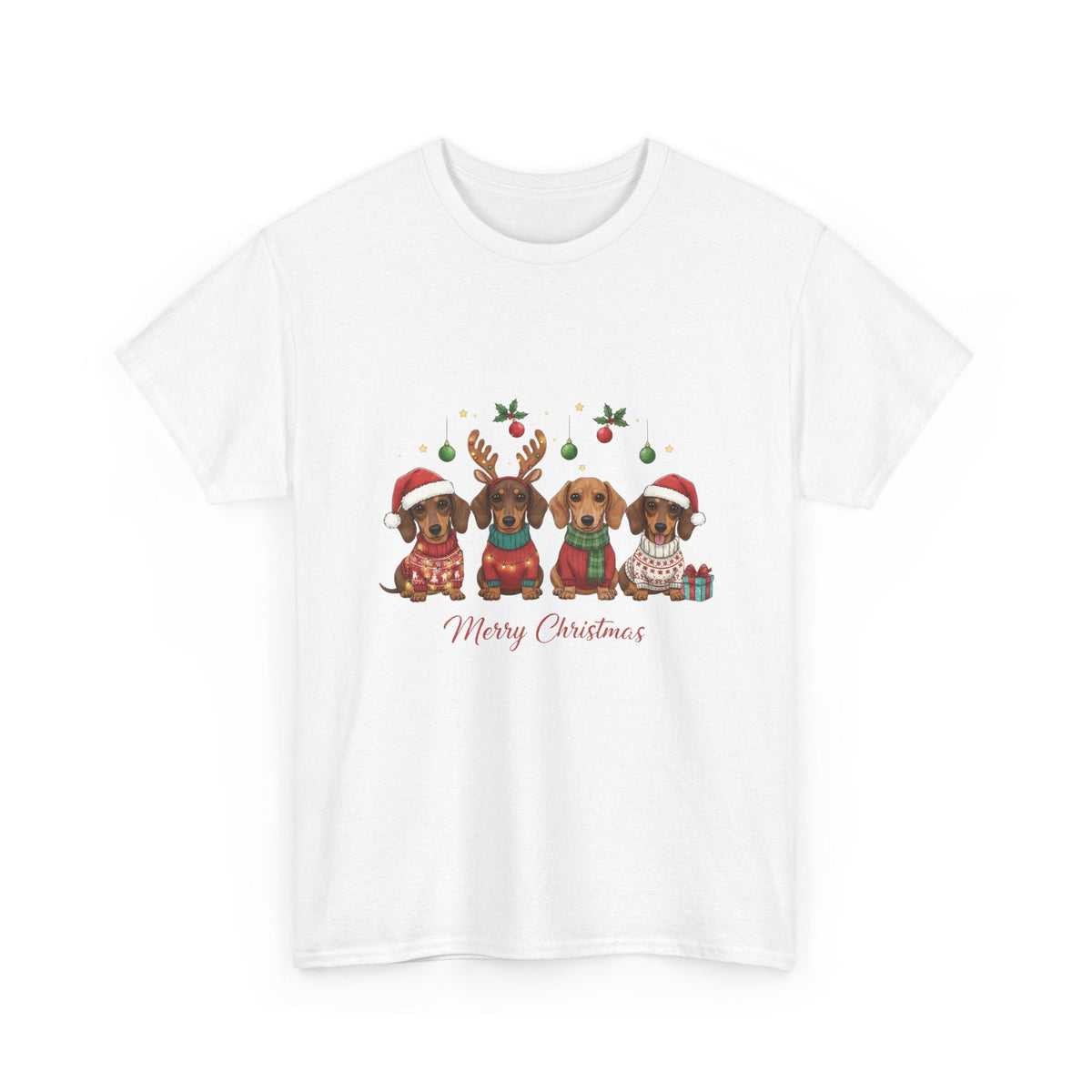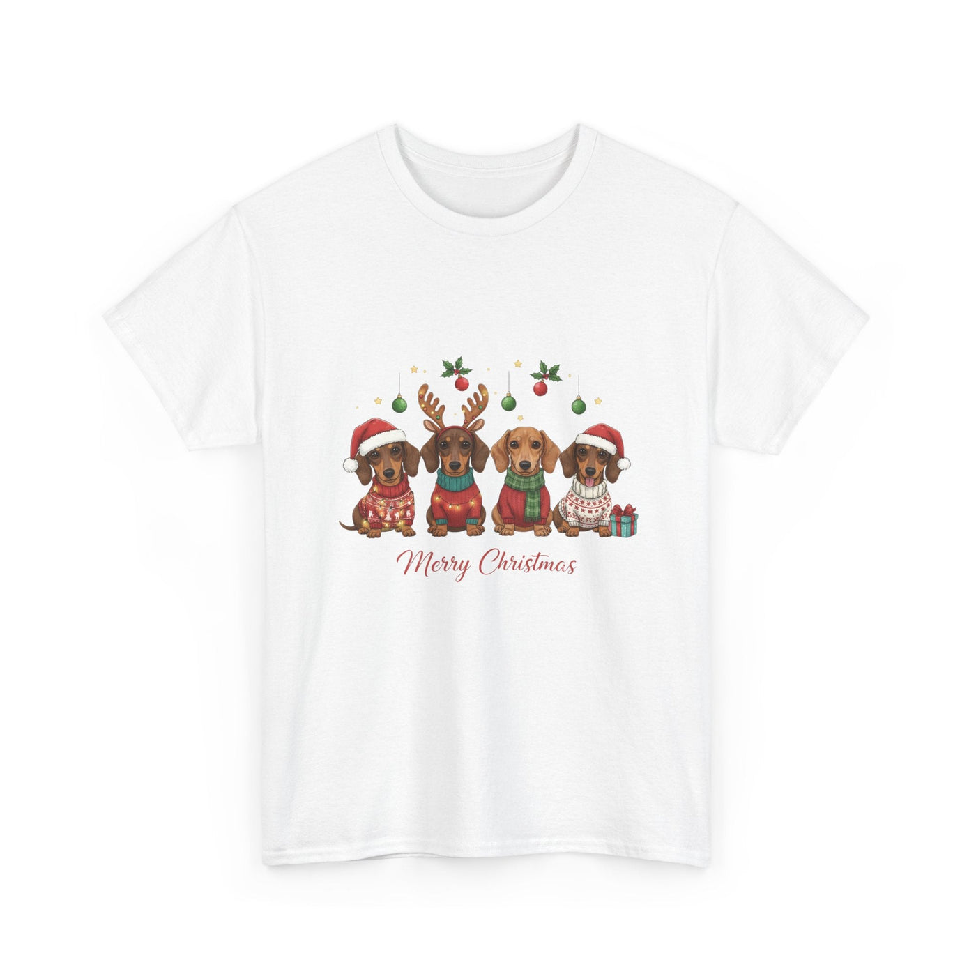 Wrap yourself in festive warmth with this Unisex Heavy Cotton Christmas Dachshund Tee, featuring four charming dachshunds dressed in cozy hats and sweaters. The softly illustrated design rests comfortably across the chest, accented with holly sprigs, tiny gift details, and a gentle “Merry Christmas” script for a nostalgic, heartwarming touch.