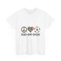 Show off your passion for the game and good vibes with this Unisex Heavy Cotton Tee featuring a “Peace, Love, Soccer” design. Crafted for comfort and style, it’s perfect for game days, casual outings, or relaxed weekends. Ideal for soccer fans who value positivity and teamwork, this tee brings a playful, sporty touch to any outfit.