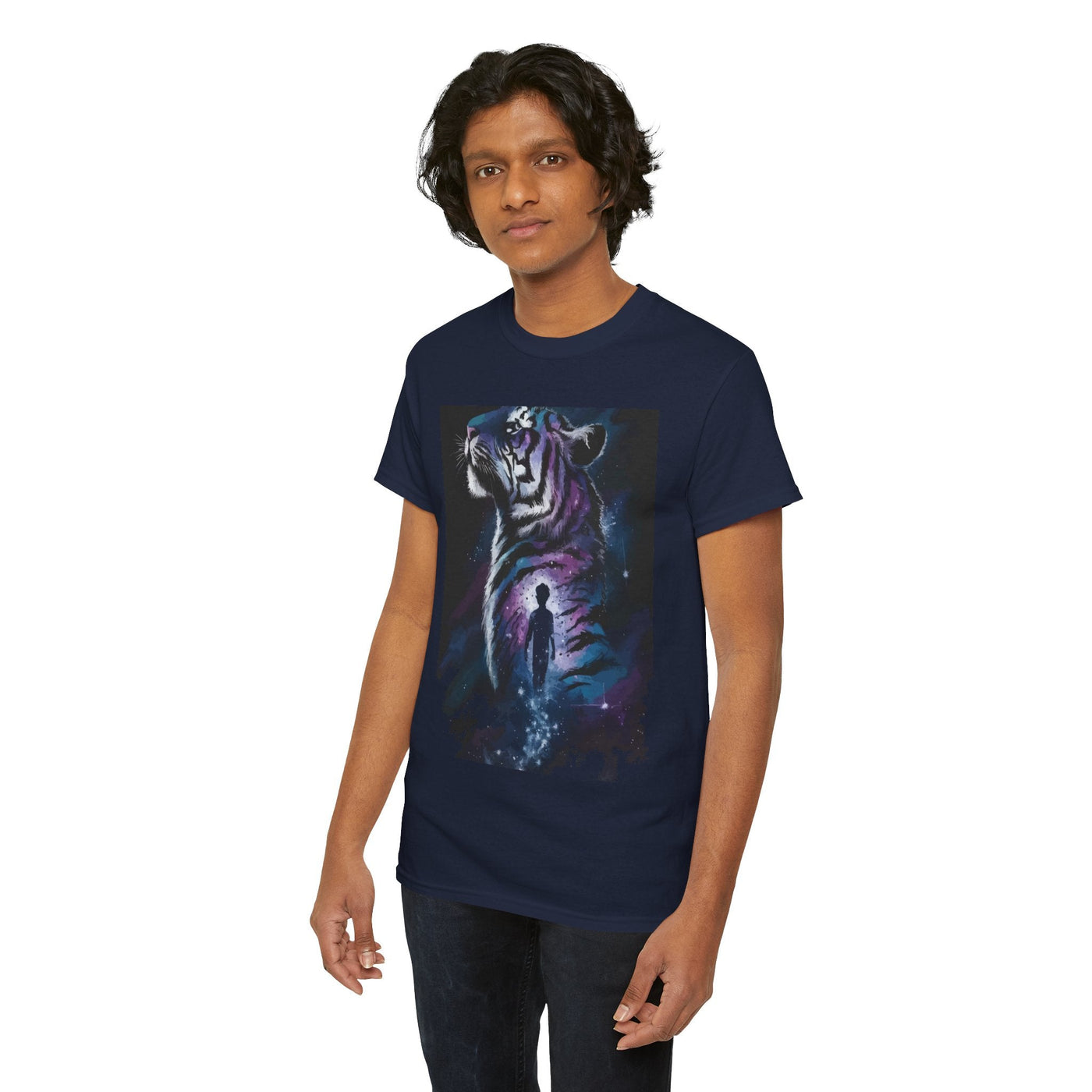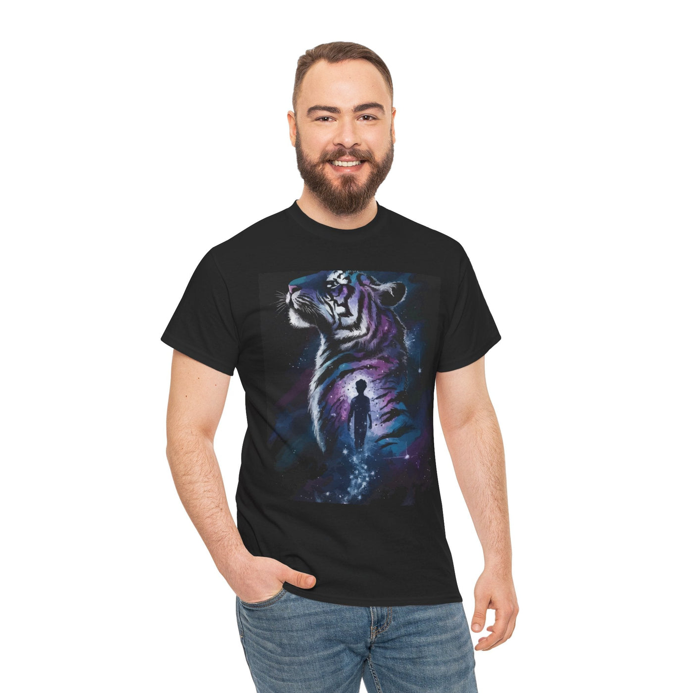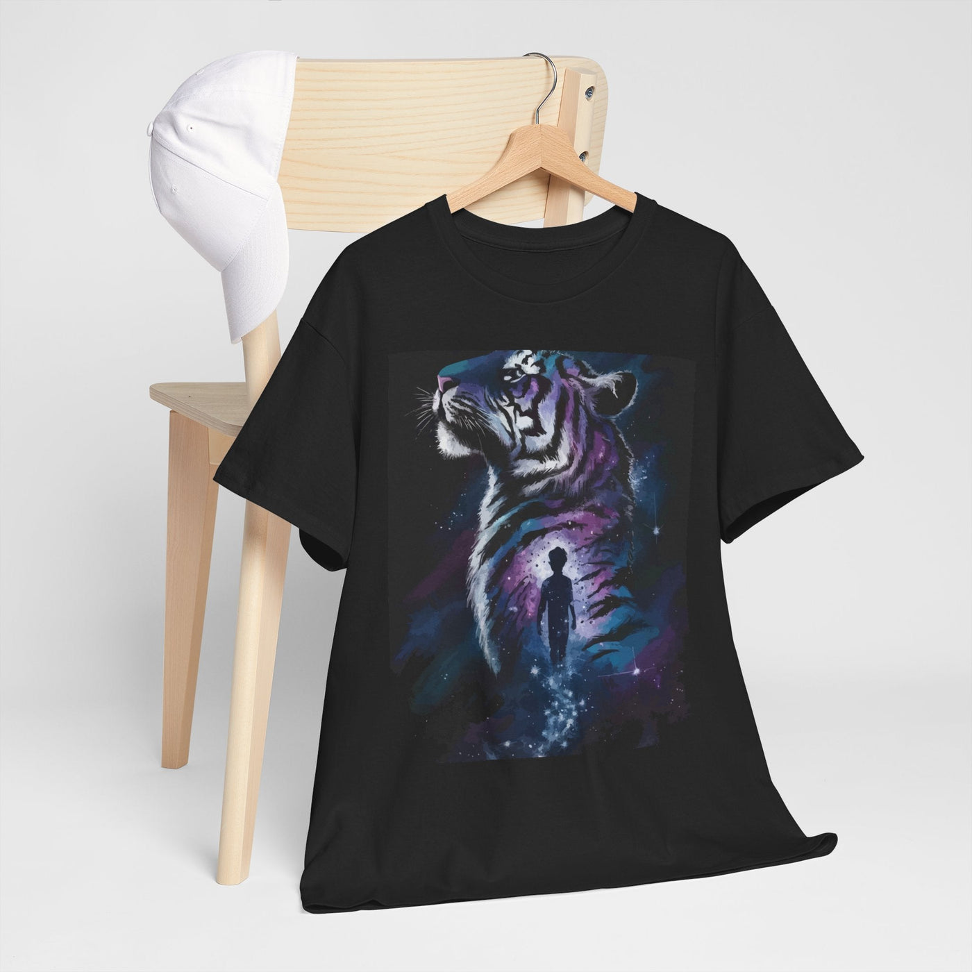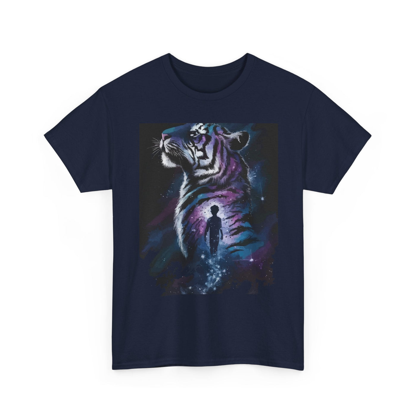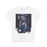 Step into a world of imagination with this Unisex Heavy Cotton Tee, featuring a striking design of a majestic tiger alongside a wistful figure. Perfect for art lovers, nature enthusiasts, and anyone who values creativity and bold expression.