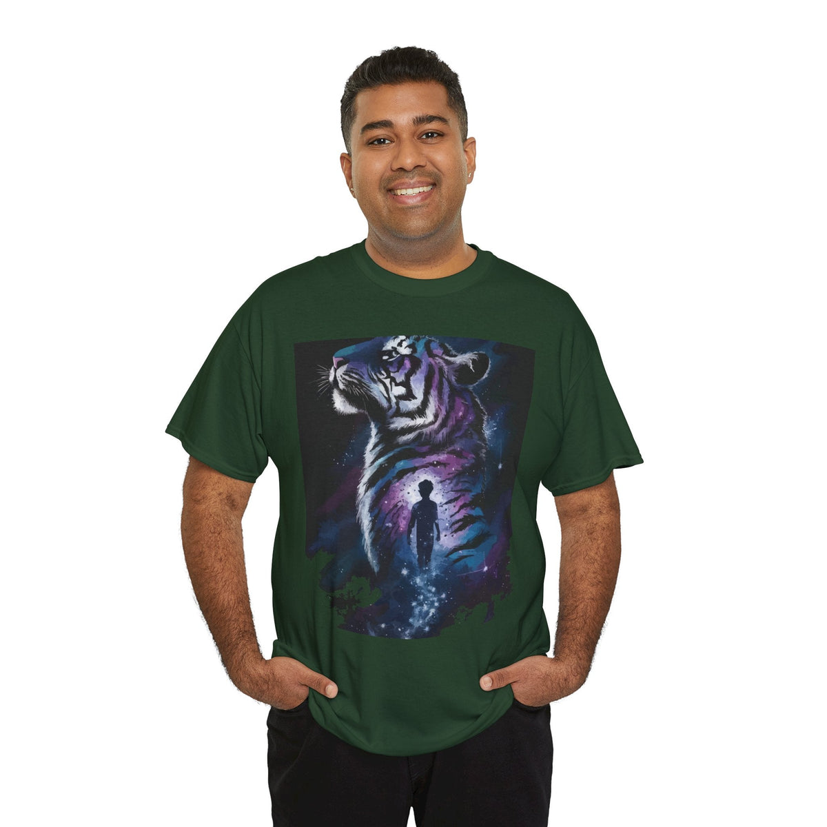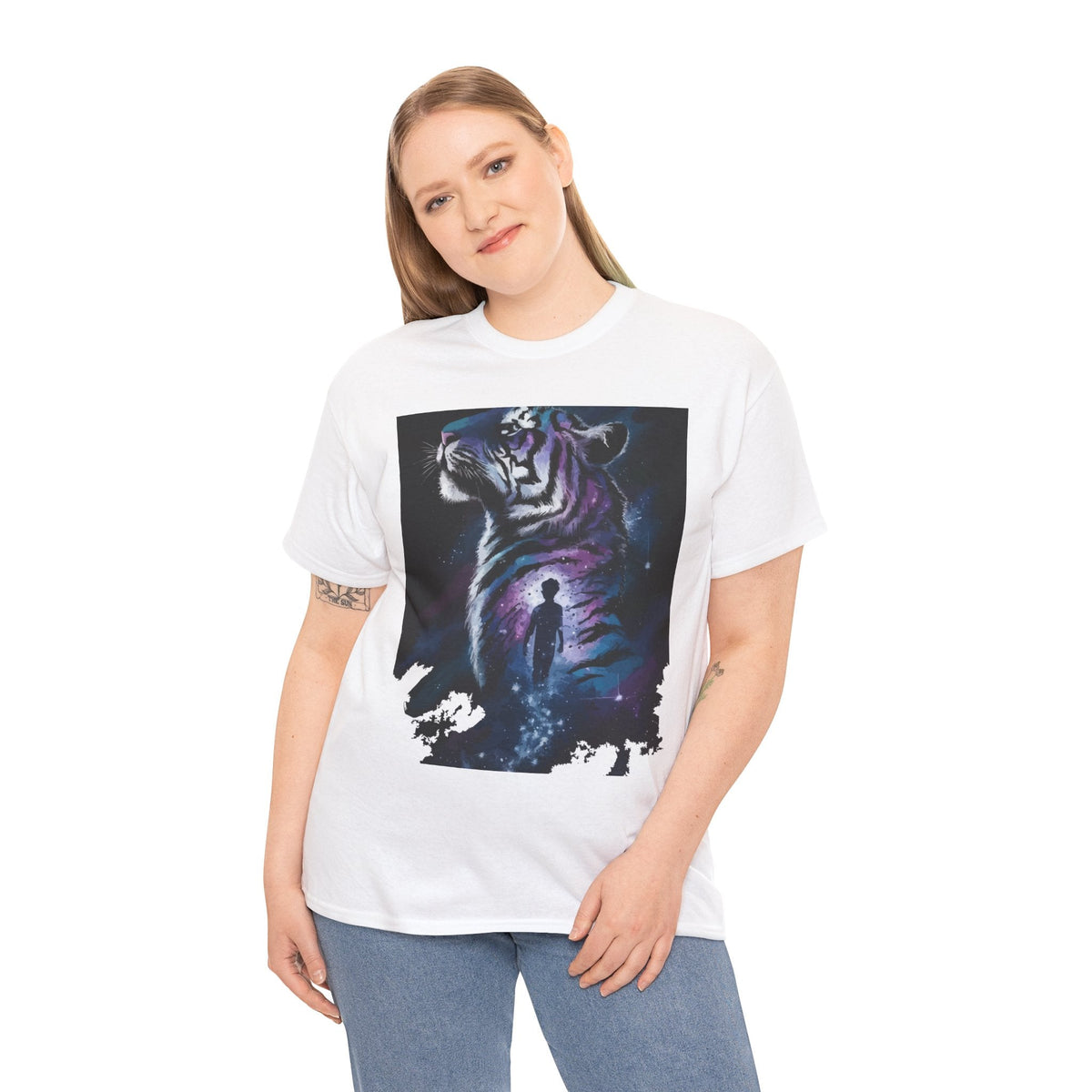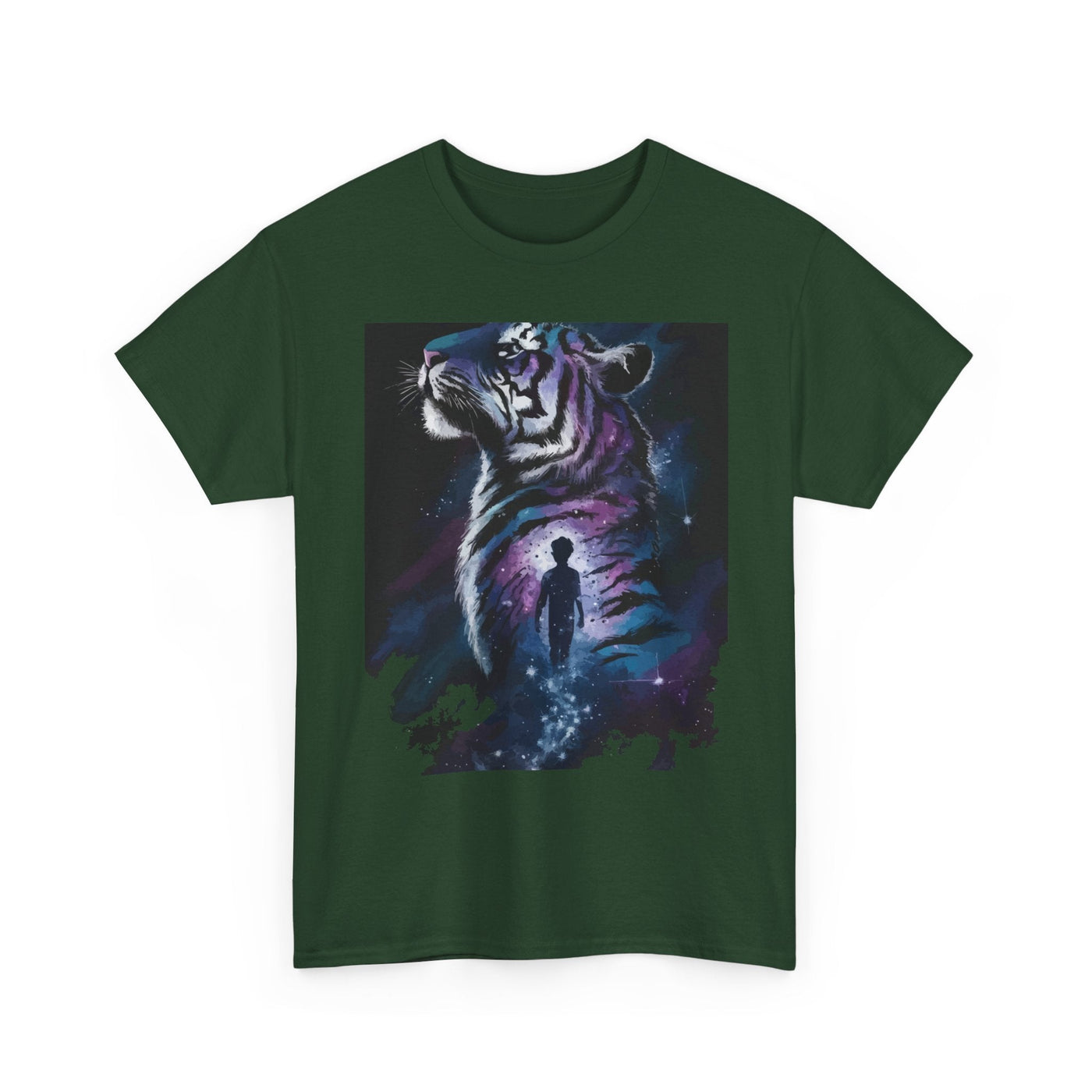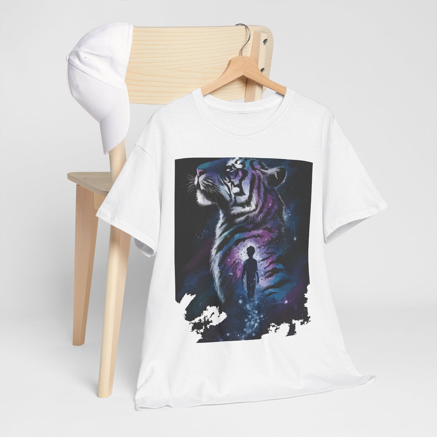 Step into a world of imagination with this Unisex Heavy Cotton Tee, featuring a striking design of a majestic tiger alongside a wistful figure. Perfect for art lovers, nature enthusiasts, and anyone who values creativity and bold expression.