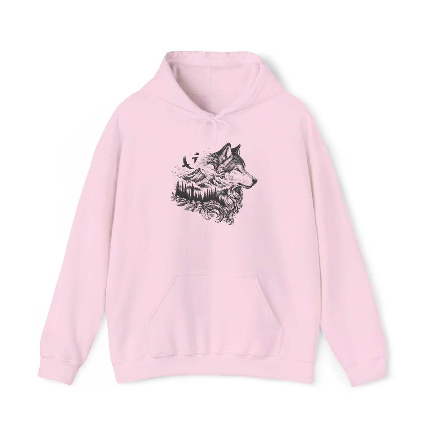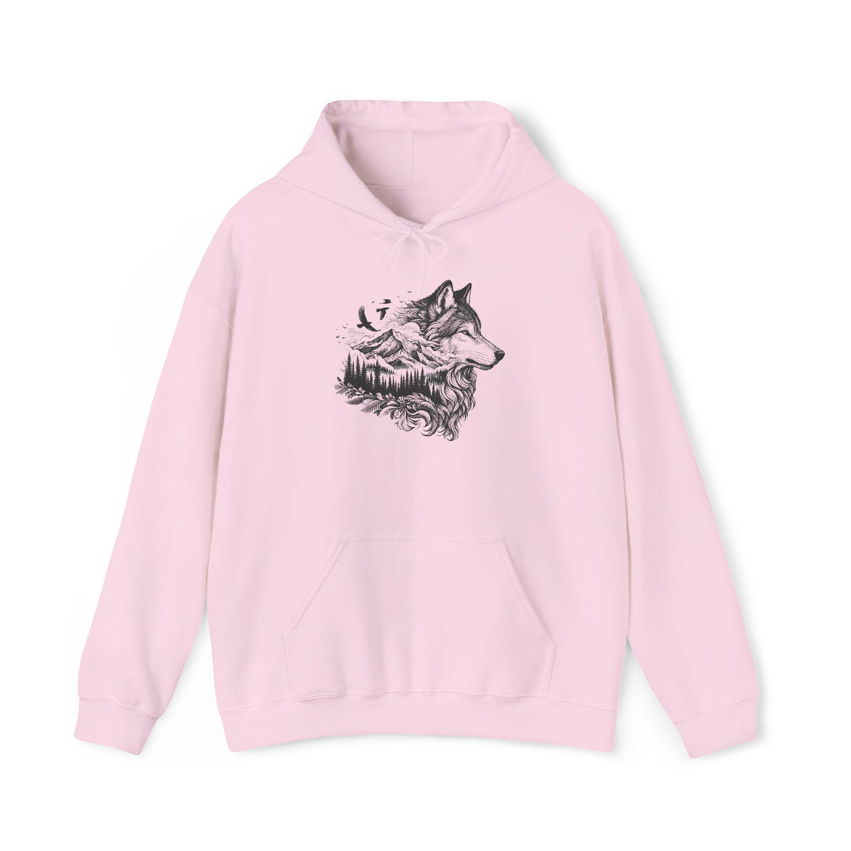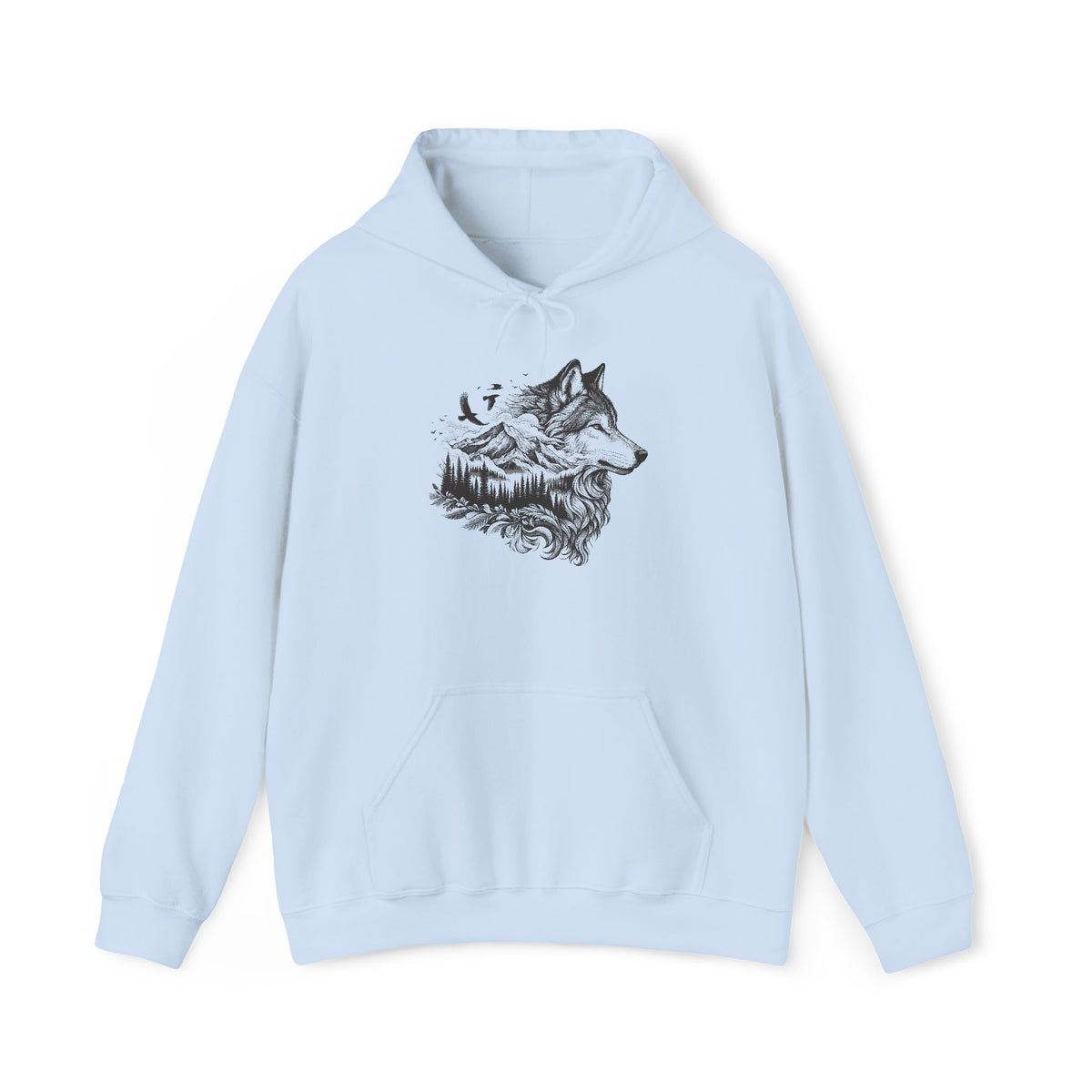 Soft, warm, and quietly bold — this hooded sweatshirt pairs cozy everyday wear with a nature-inspired illustration that feels like a personal emblem. A finely detailed wolf-and-mountain sketch sits over the chest, its linework suggesting wind, timber, and open trails. The medium-heavy 50/50 cotton-poly blend holds shape and print clarity, while the double-lined hood, color-matched drawcord, and roomy kangaroo pocket deliver comfort that lasts through chilly mornings and late-night campfires. Wear it when you need a little wilderness close at hand — layered over a tee for hikes, beside the fire at a cabin, or on morning coffee runs when you want something simple and sincere.