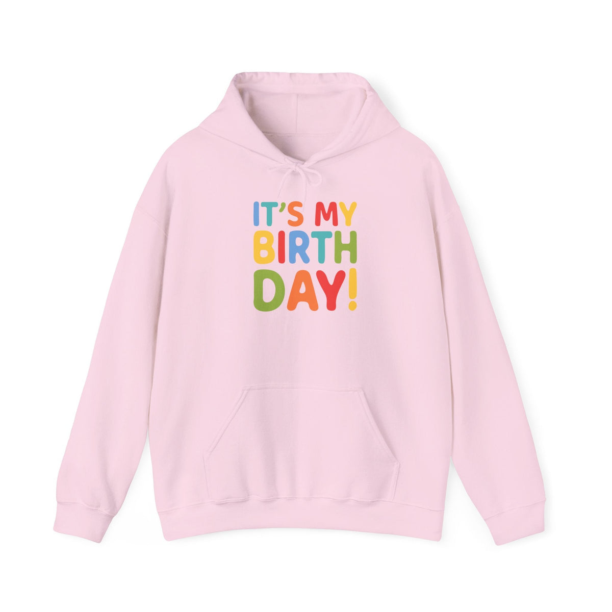 This cozy midweight hoodie brings soft birthday joy to your everyday look. The multicolored “IT’S MY BIRTHDAY!” graphic adds a playful, celebratory touch without being too loud. A kangaroo pocket and double-lined hood keep things warm and comfortable. Perfect for morning coffee runs, casual outings, or simply embracing your day with a smile.