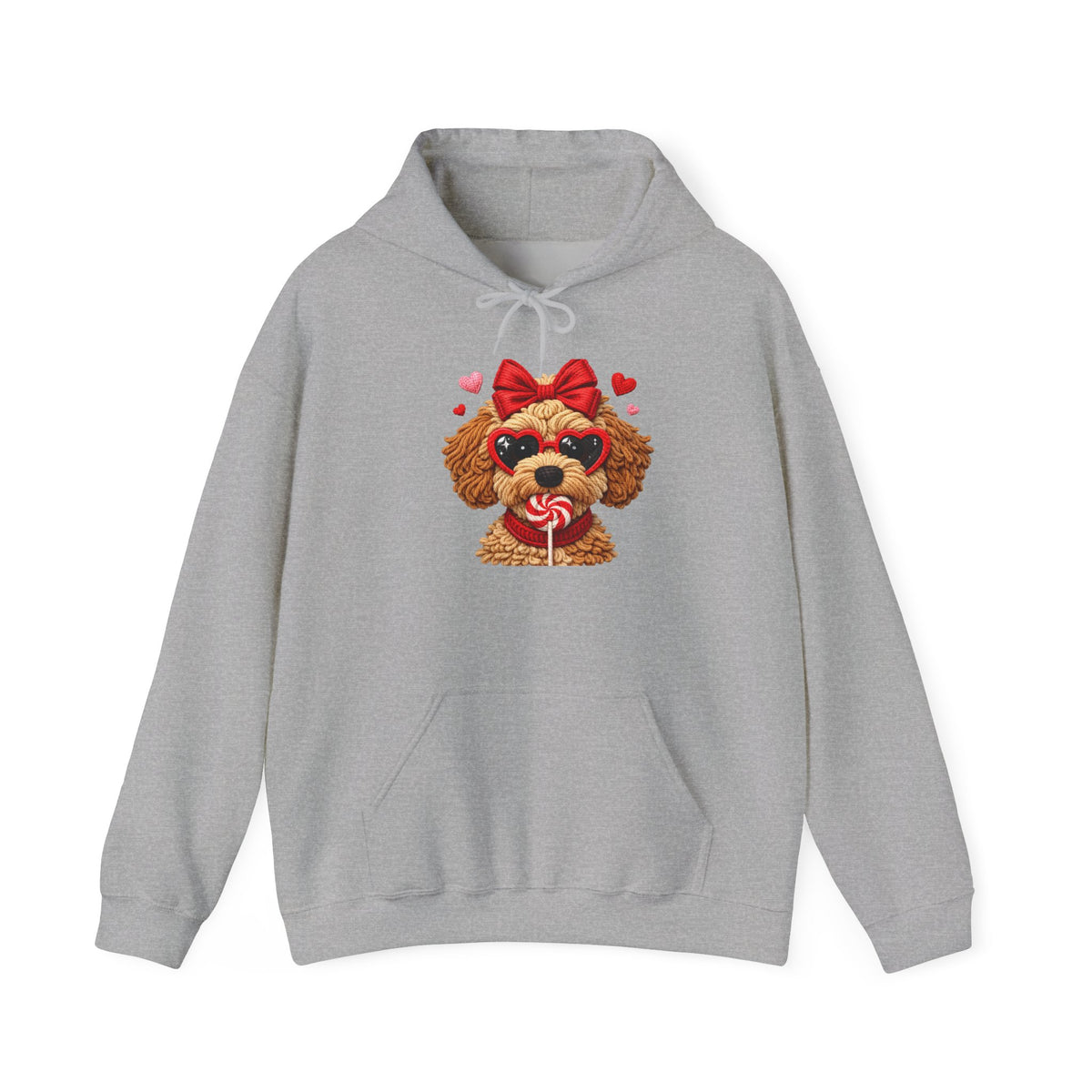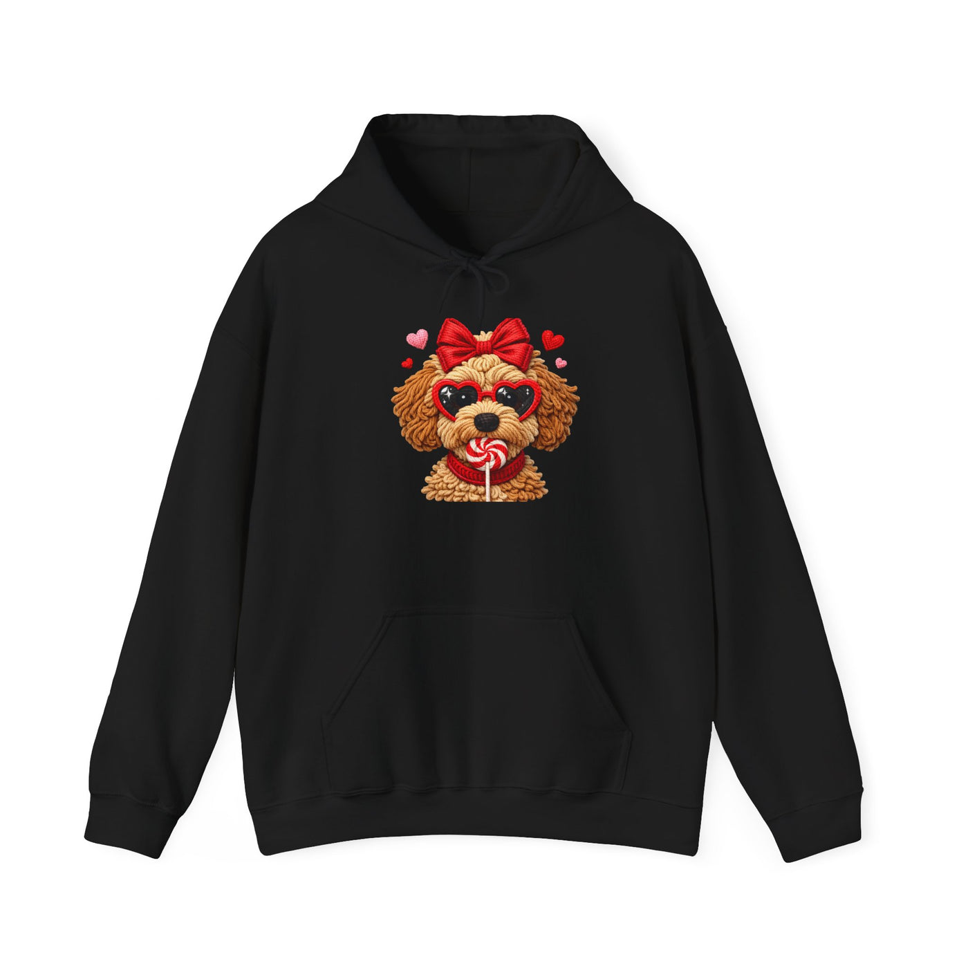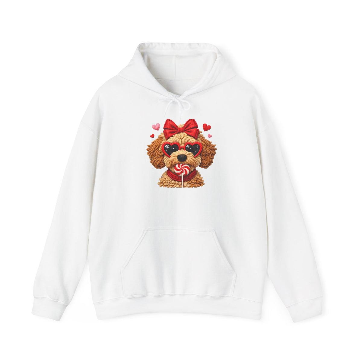 This cozy hoodie carries a little pocket of joy — a fluffy, bow-topped pup clutching a heart-shaped lollipop, surrounded by tiny floating hearts. It’s warm and soft against the skin, with a roomy kangaroo pocket and a double-lined hood you can pull up when the day turns crisp. The design reads playful and affectionate, a subtle statement for anyone who loves sweet, whimsical style without shouting for attention. Wear it on slow mornings with coffee, during relaxed walks with your dog, or curled up on the couch watching feel-good movies. The embroidered-look artwork and clean white backdrop make the image pop while keeping the overall vibe light and tender.