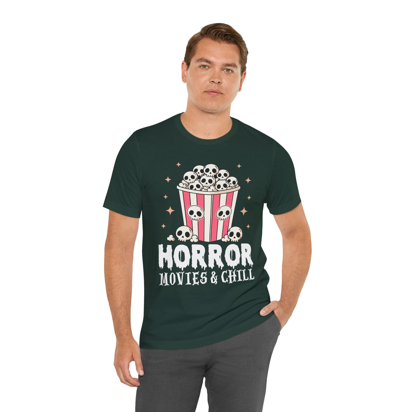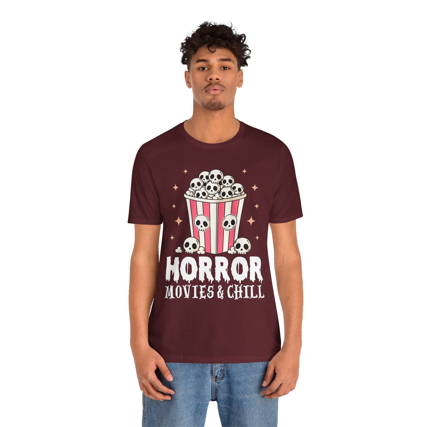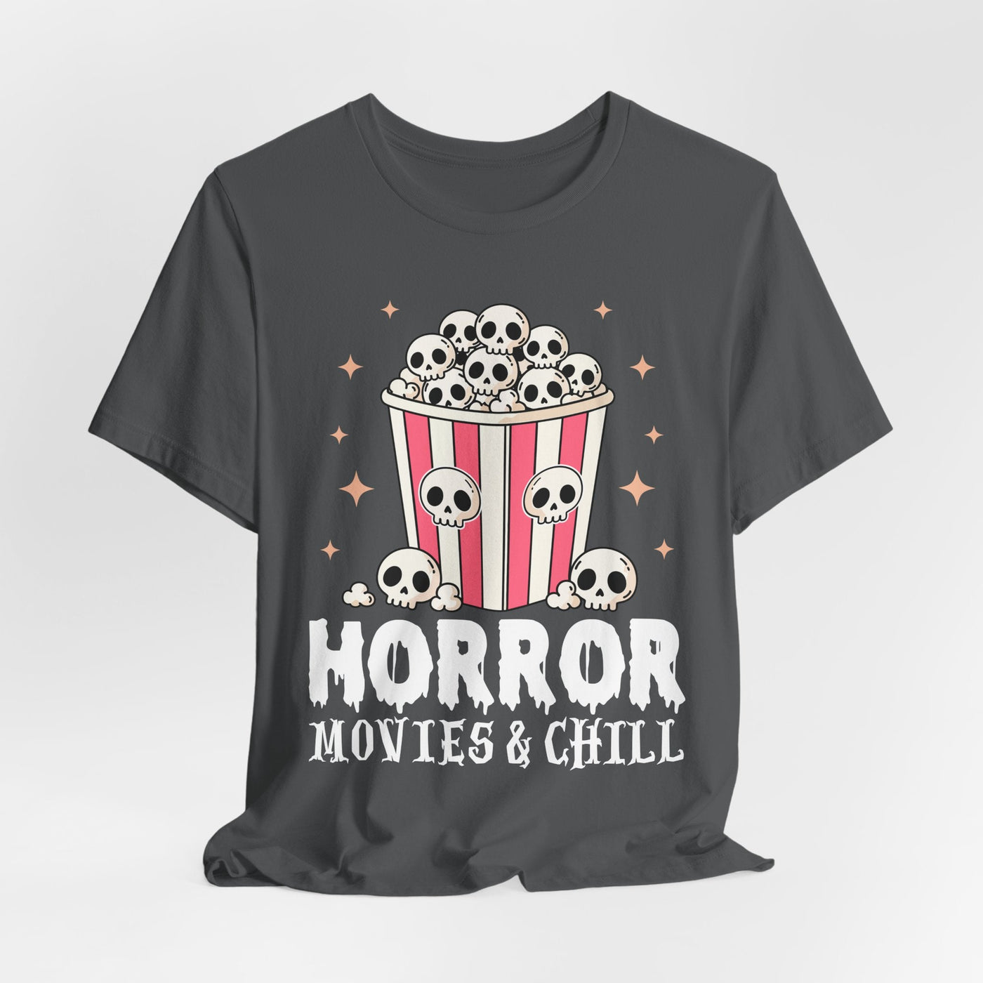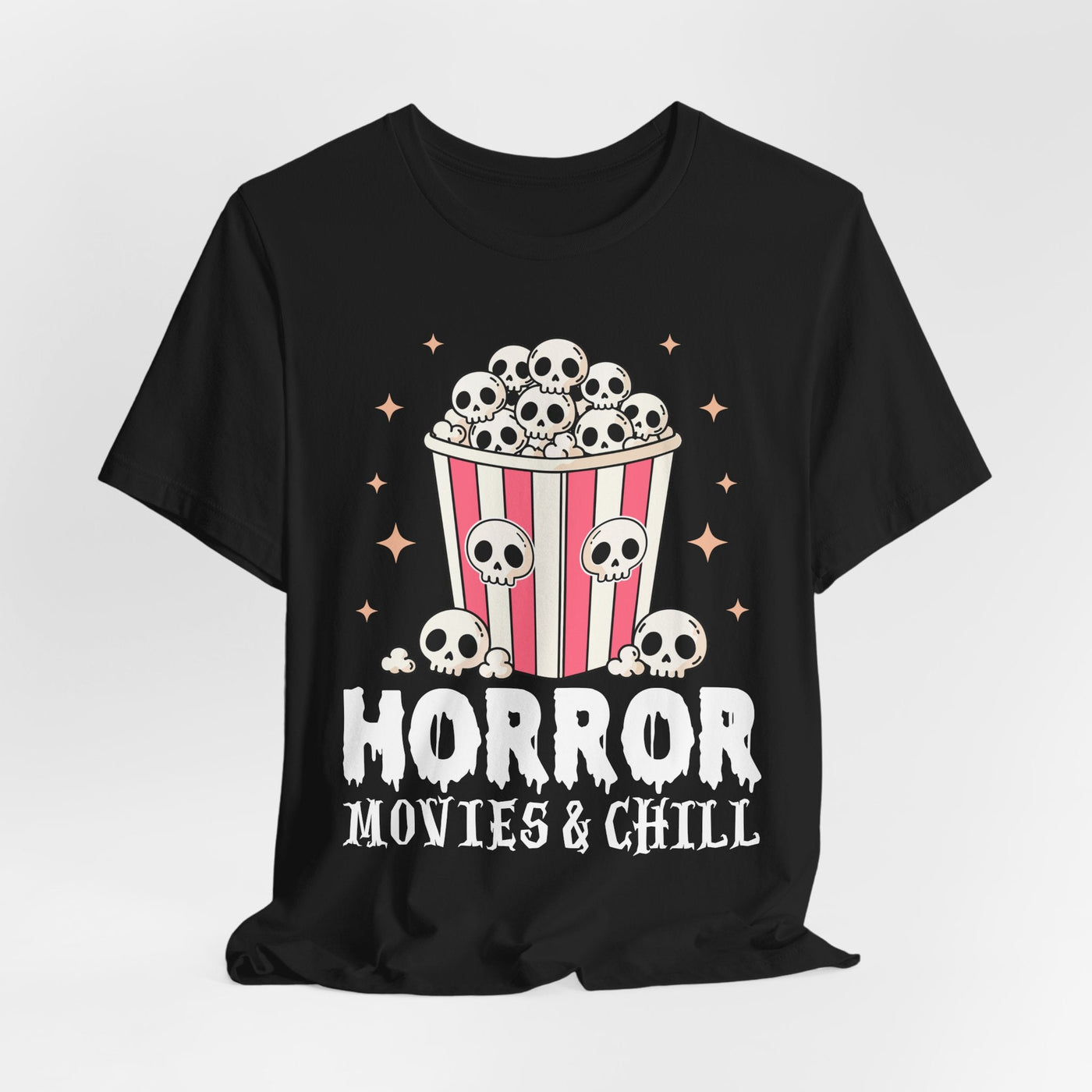 The Horror Movies & Chill T-Shirt is a unisex jersey short sleeve tee that combines comfort with spooky fun. Featuring a playful horror-inspired design, this graphic tee is perfect for movie nights, Halloween parties, themed events, or casual outings with friends. Ideal for horror film fans and adults who enjoy a relaxed vibe, it makes a great gift for birthdays, holidays, or any occasion.