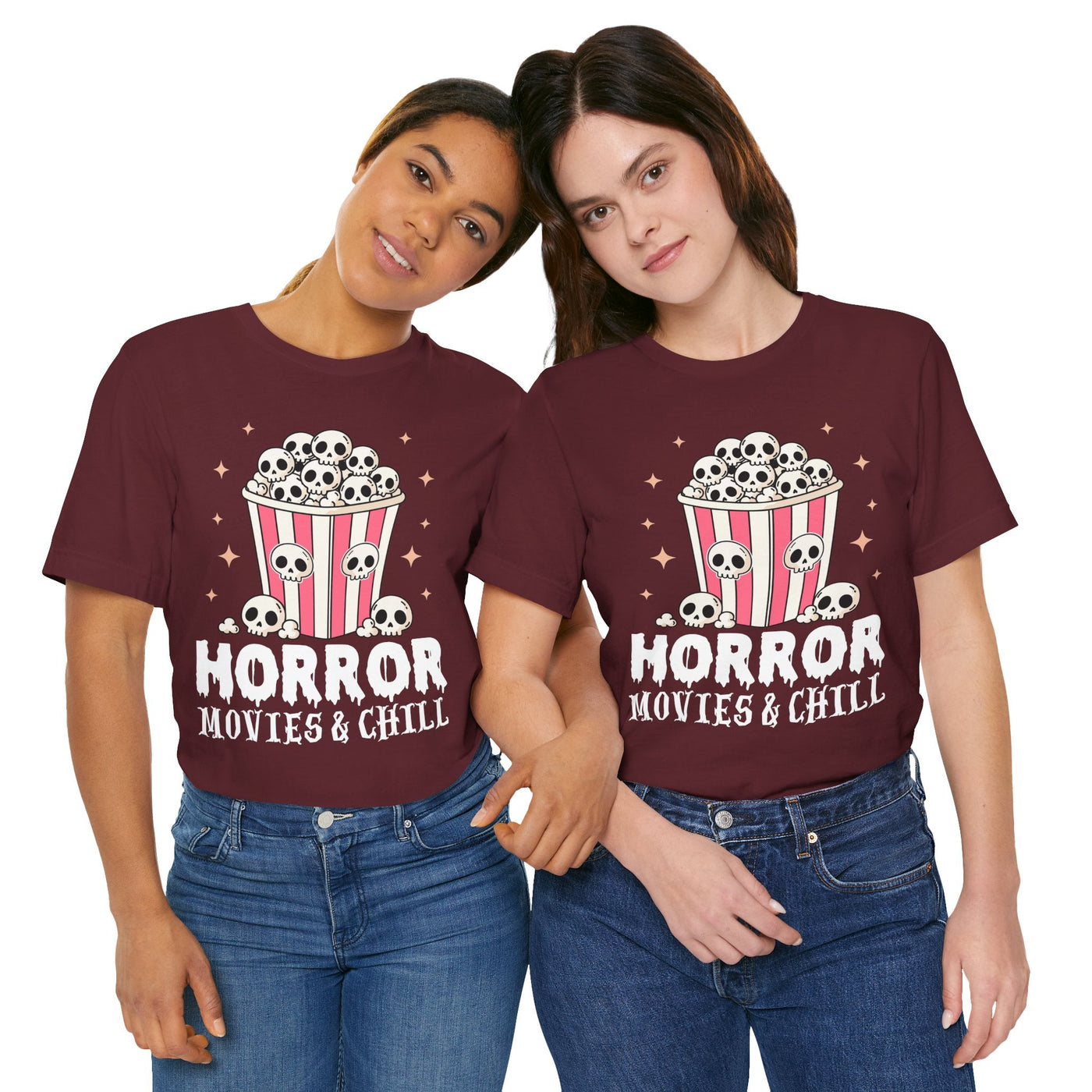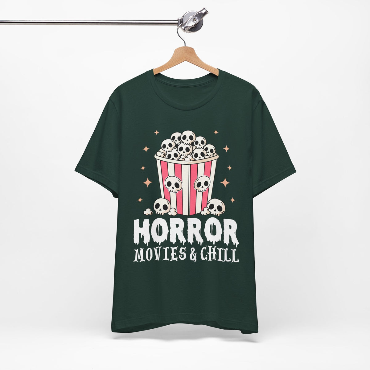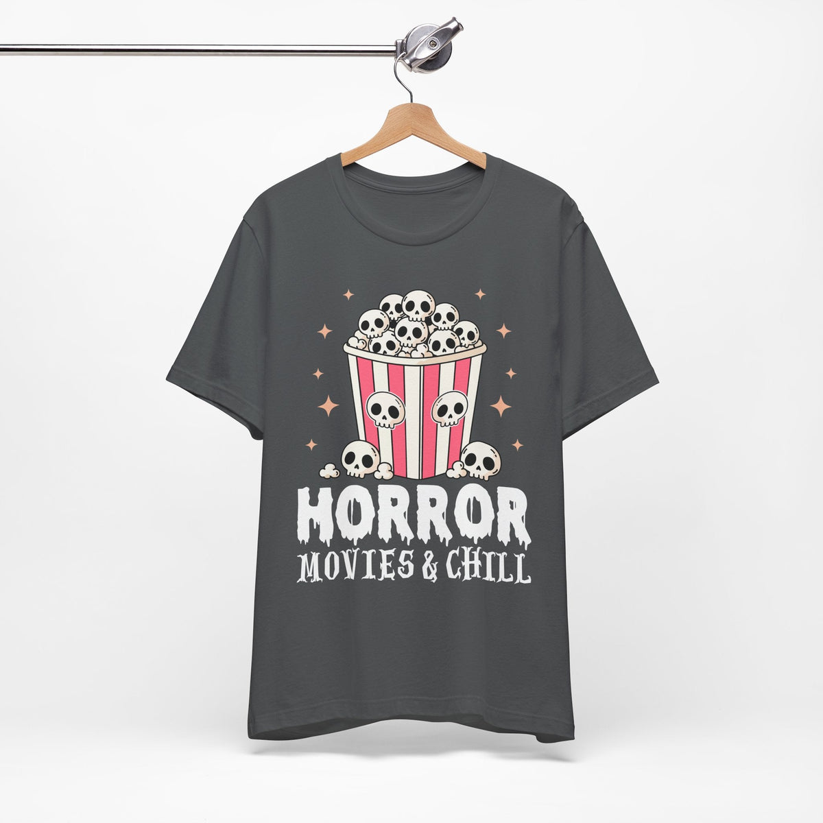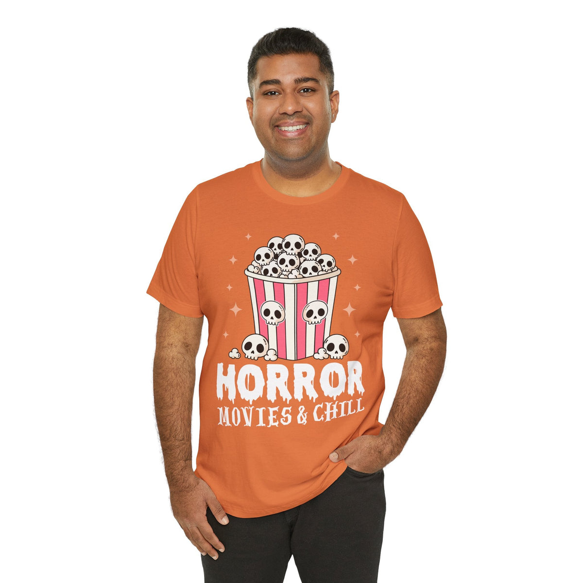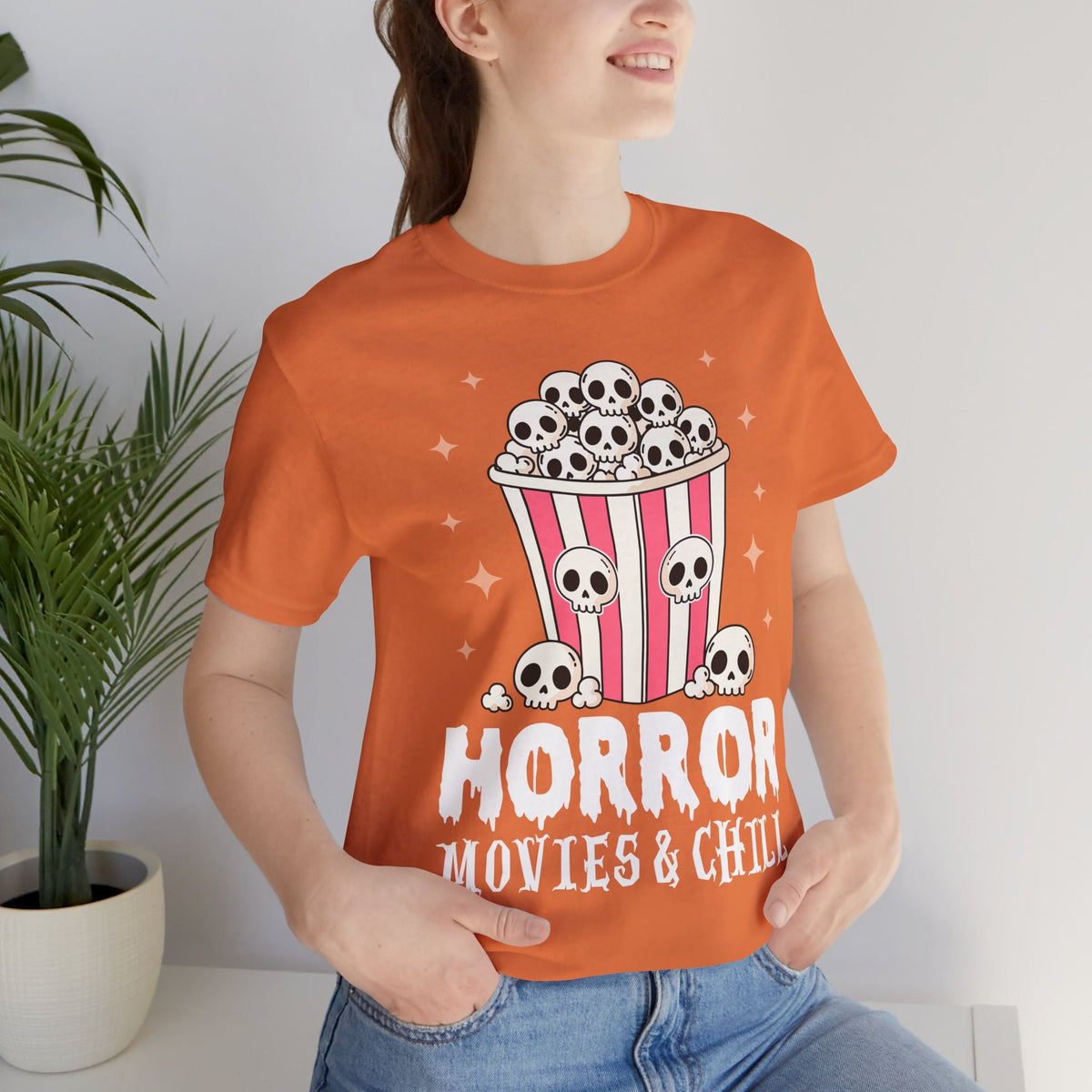 The Horror Movies & Chill T-Shirt is a unisex jersey short sleeve tee that combines comfort with spooky fun. Featuring a playful horror-inspired design, this graphic tee is perfect for movie nights, Halloween parties, themed events, or casual outings with friends. Ideal for horror film fans and adults who enjoy a relaxed vibe, it makes a great gift for birthdays, holidays, or any occasion.